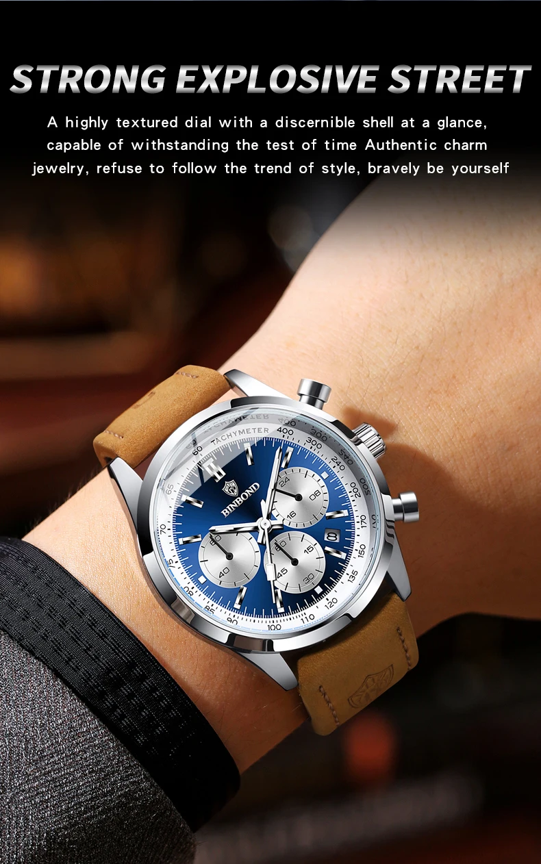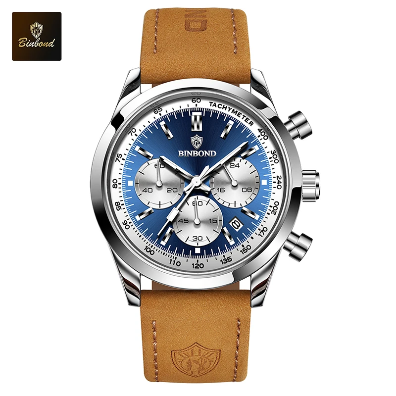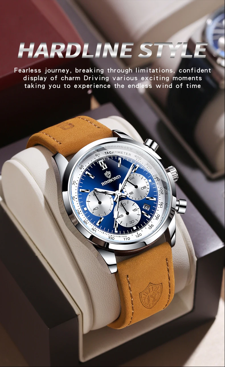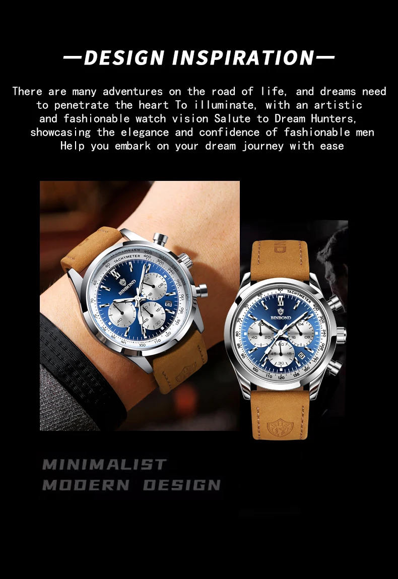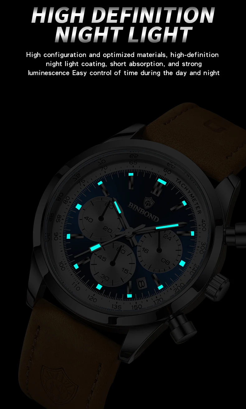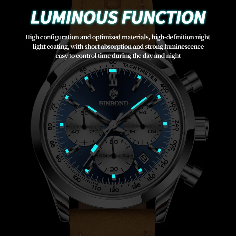 BINBOND Men’s Quartz Watch – Leather Strap, Waterproof, Luminous