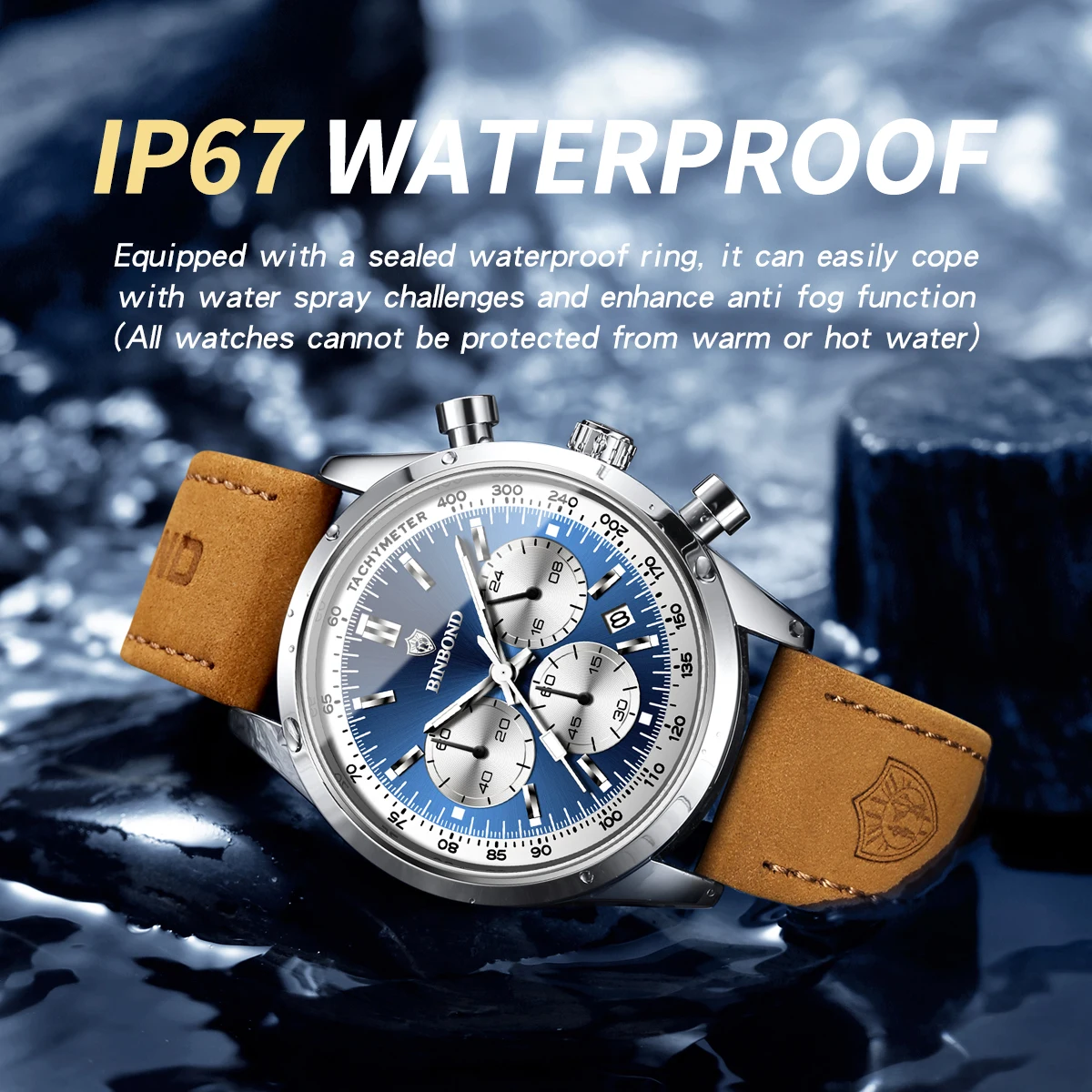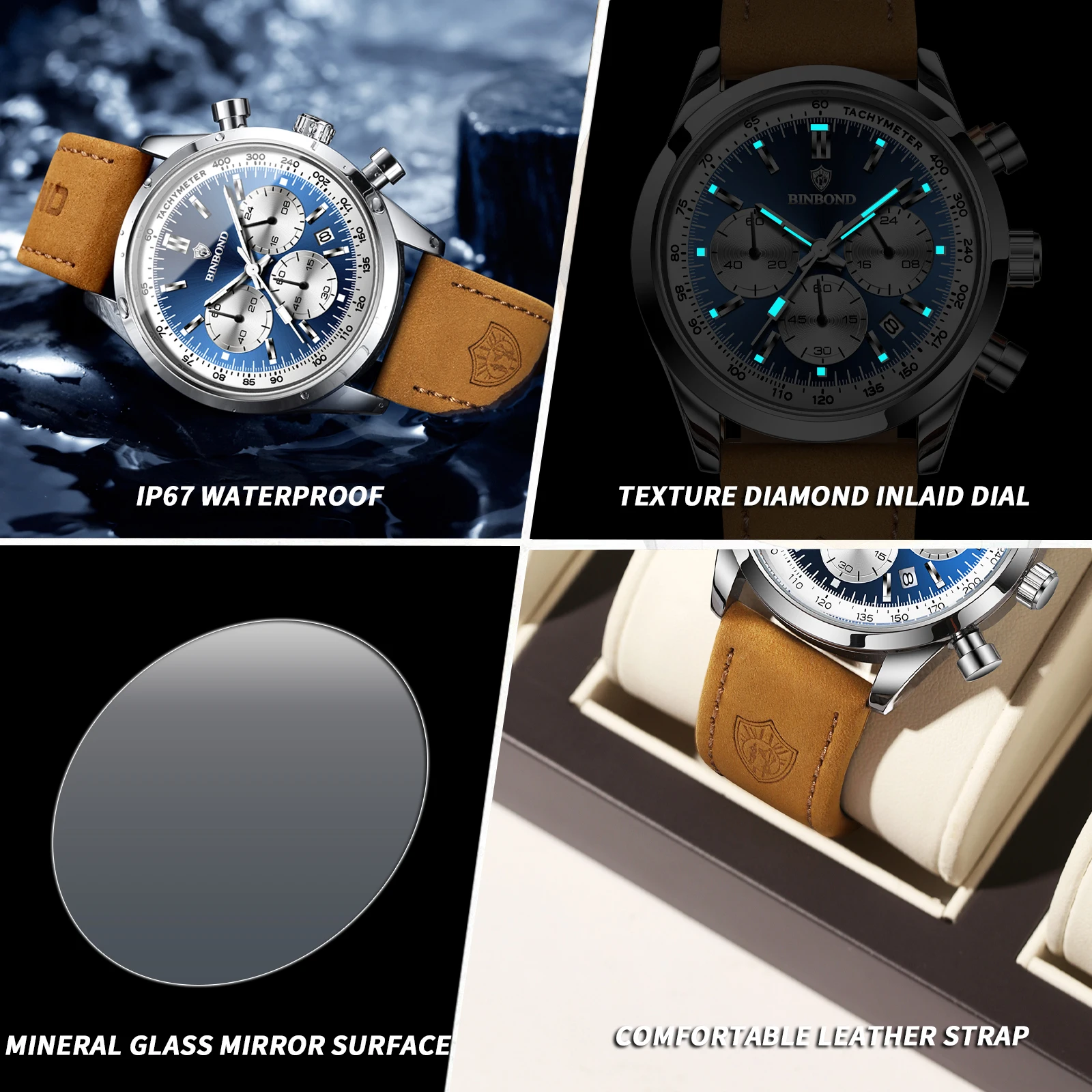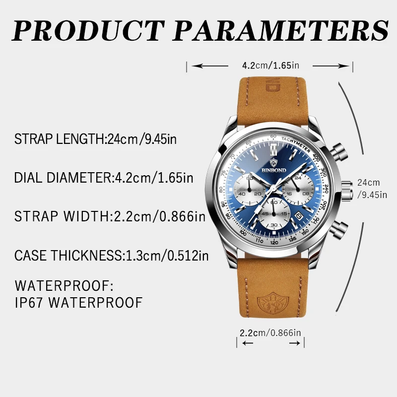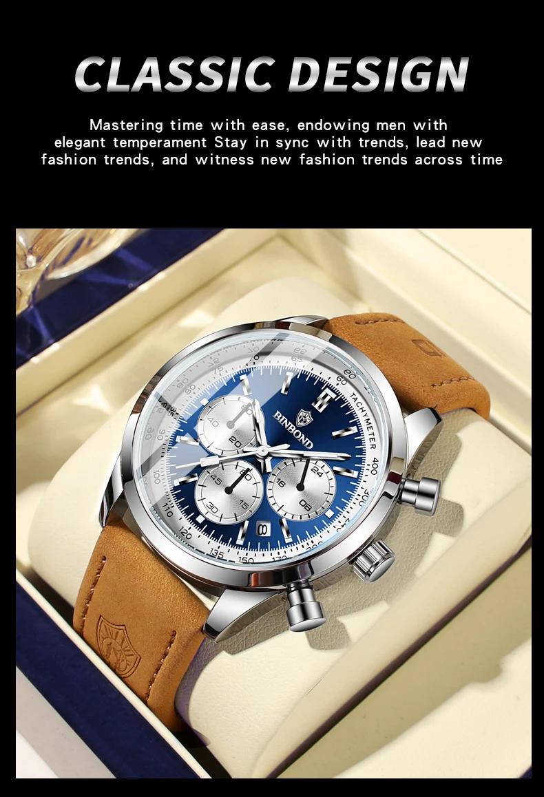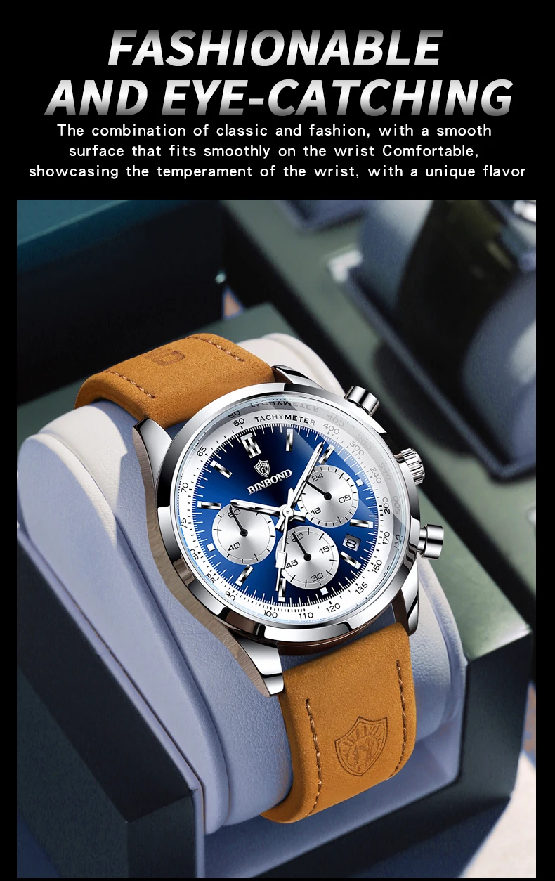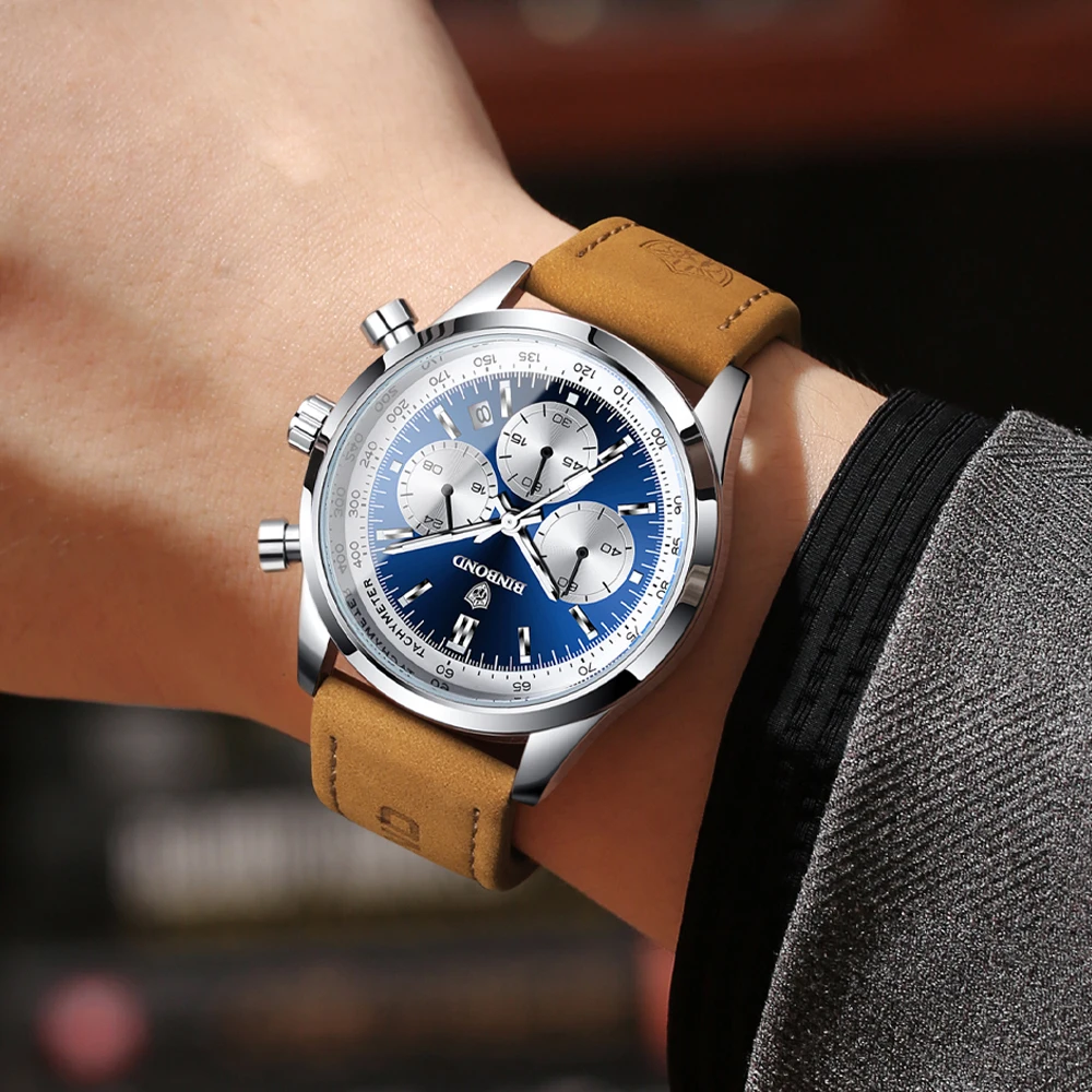 BINBOND Men’s Quartz Watch – Leather Strap, Waterproof, Luminous