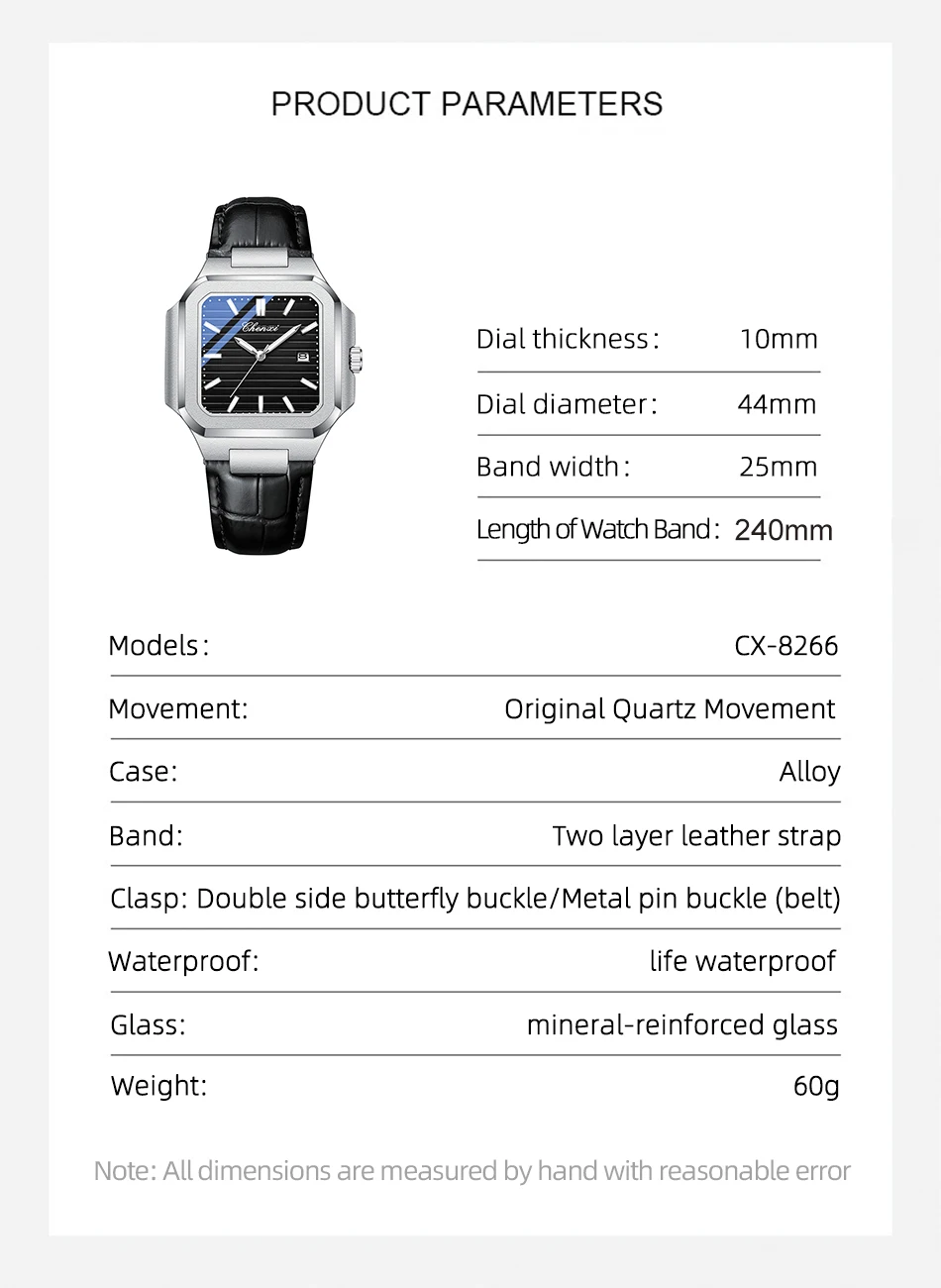 CHENXI Menβs Watch | CX-8266 Square Watch | Leather Quartz Watch | Calendar Watch | Luminous Hands Watch | Simple Casual Watch | 3ATM Water Resistant | Alloy Case Watch
