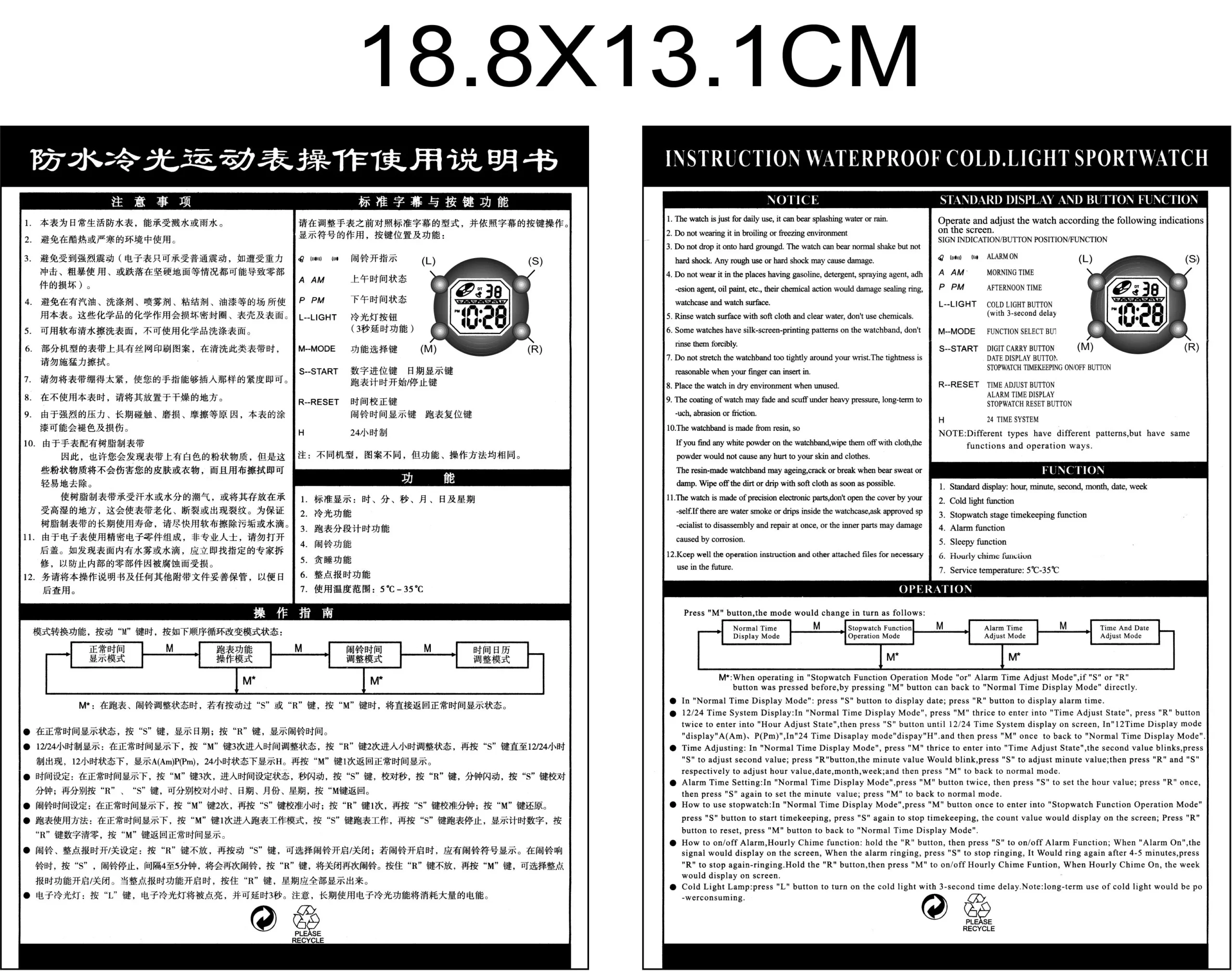 • Functions: Week display, water-resistant up to 3Bar, alarm, and LED display