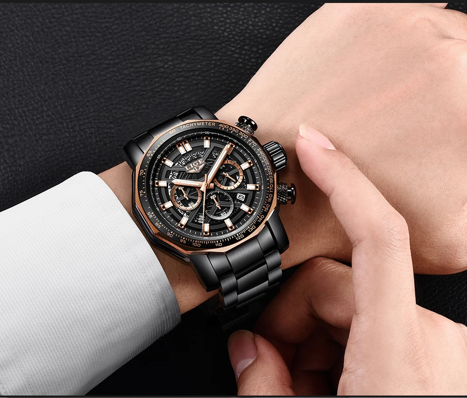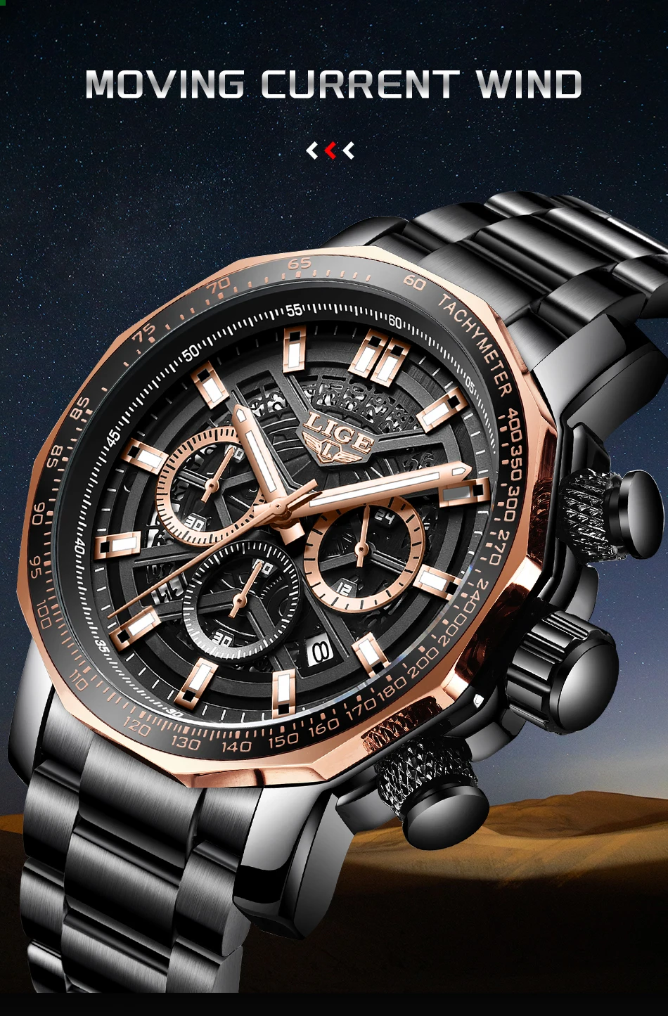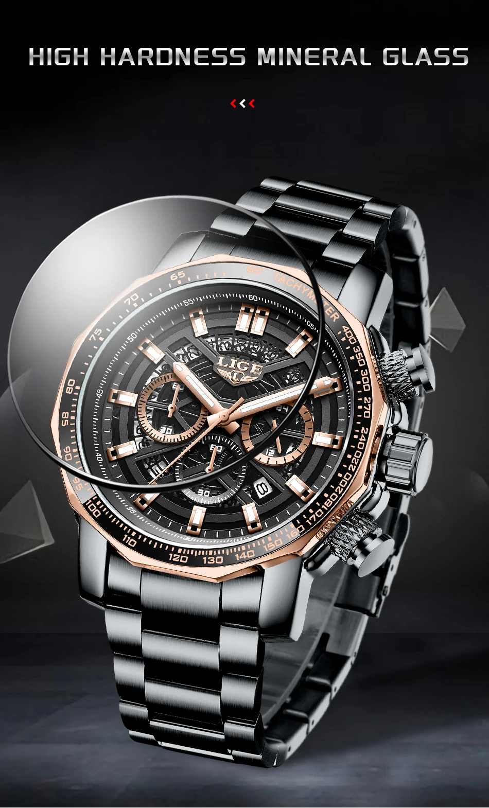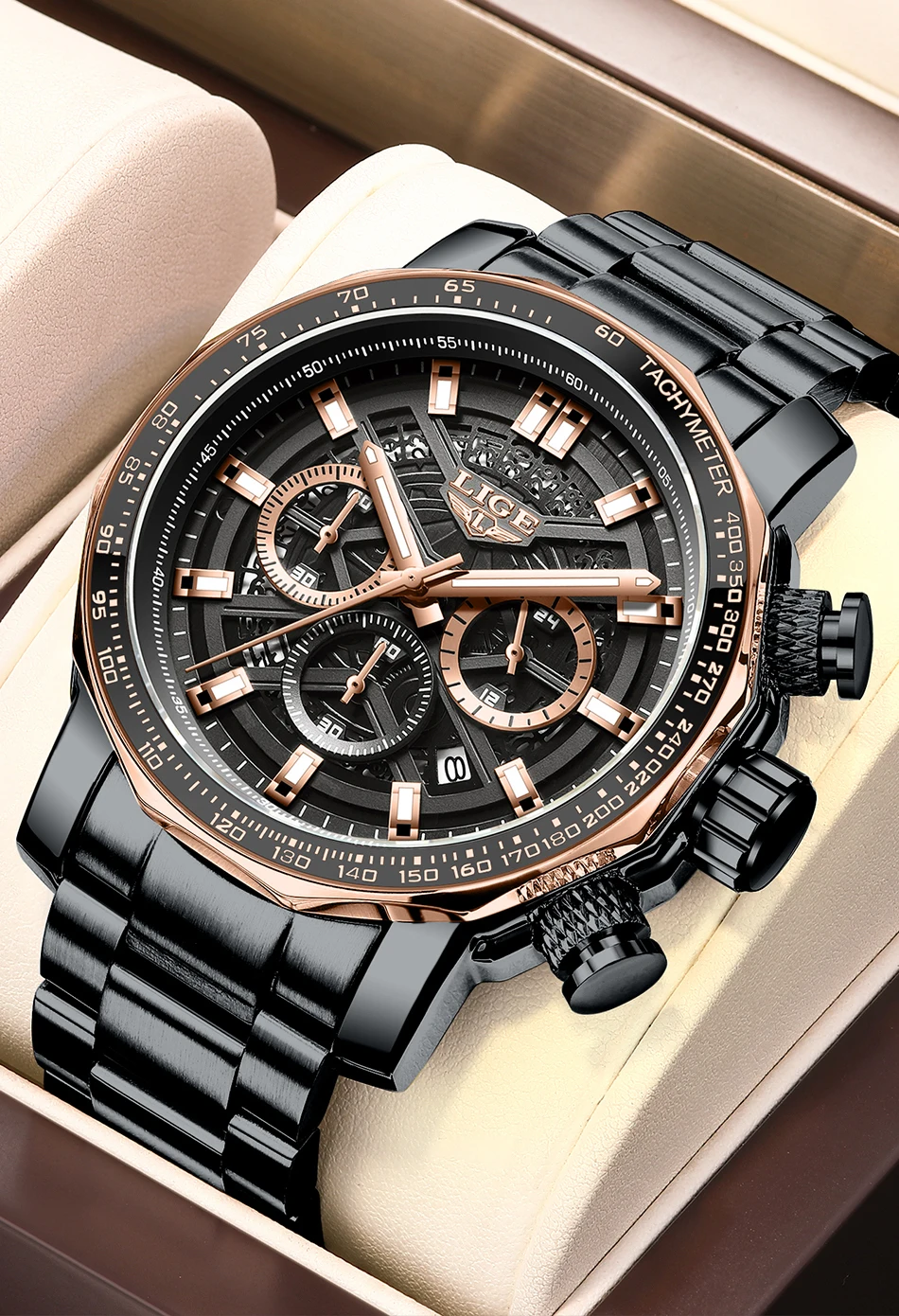 LIGE 2025 Men’s Luxury Watch – Golden Chronograph with Gift Box