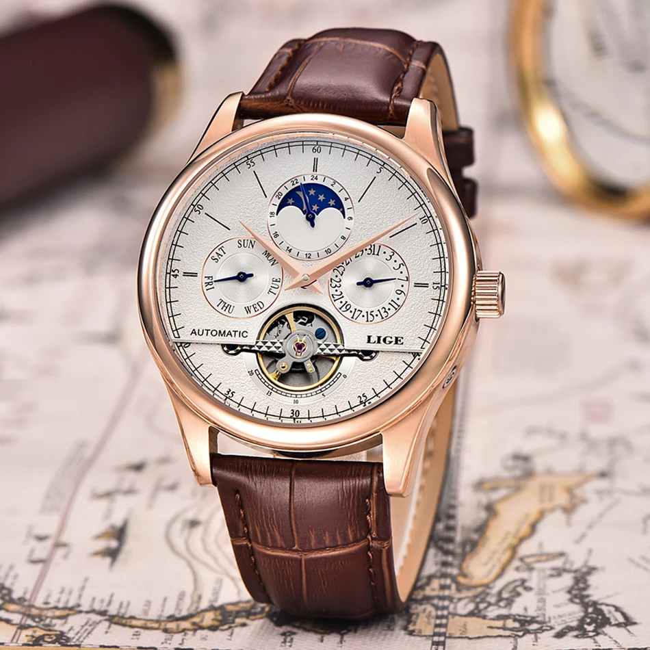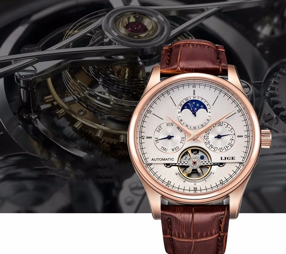 LIGE Men’s Automatic Watch – Tourbillon, Leather, Waterproof