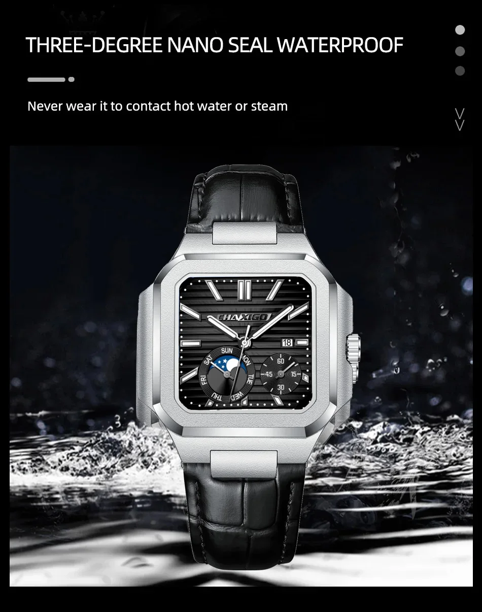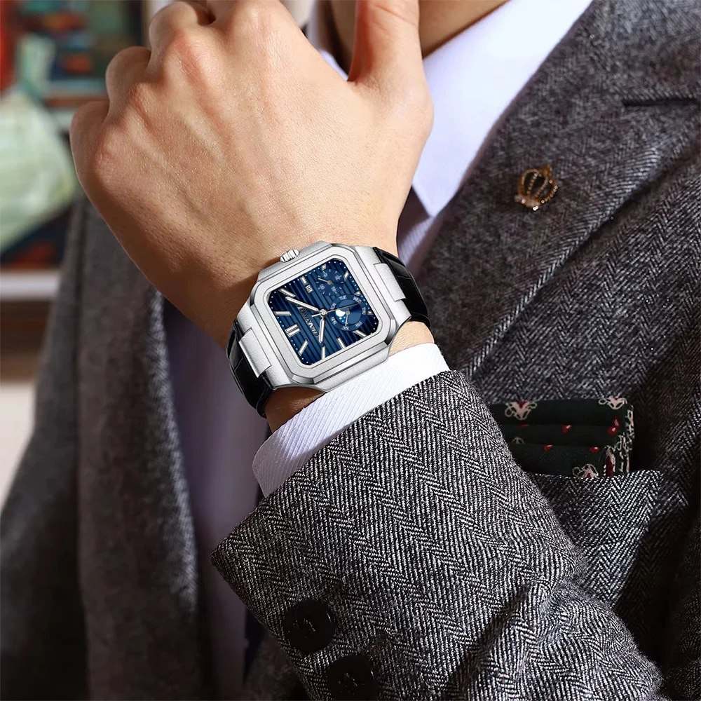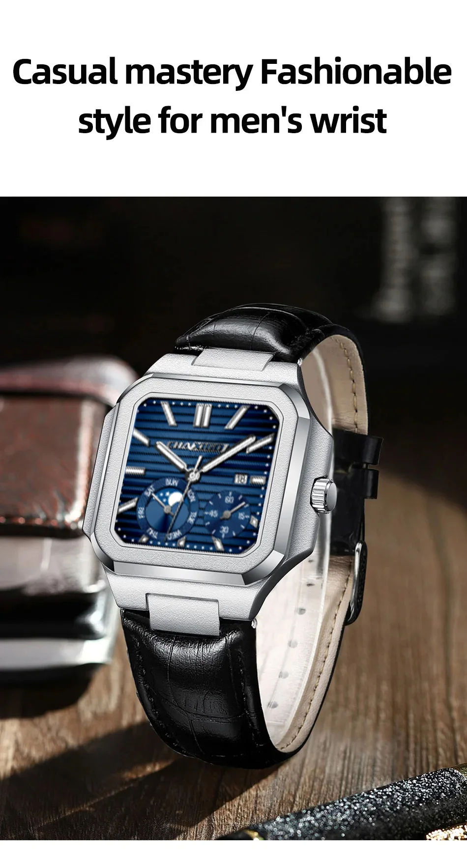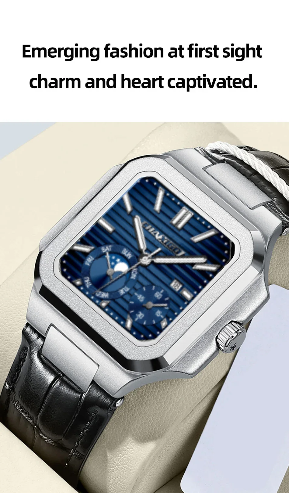Men’s Luxury Square Watch – Quartz, Leather, Waterproof, Chronograph