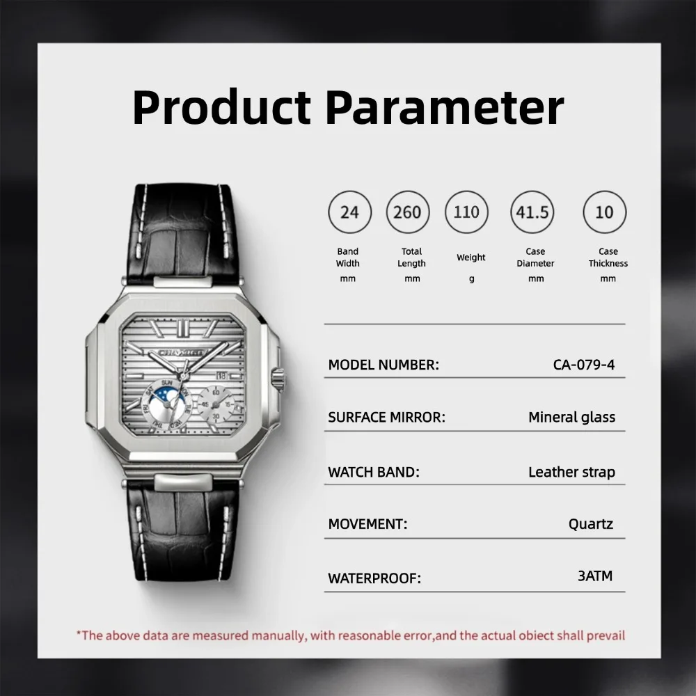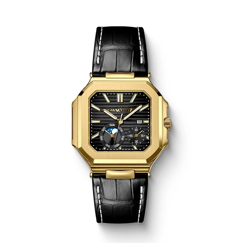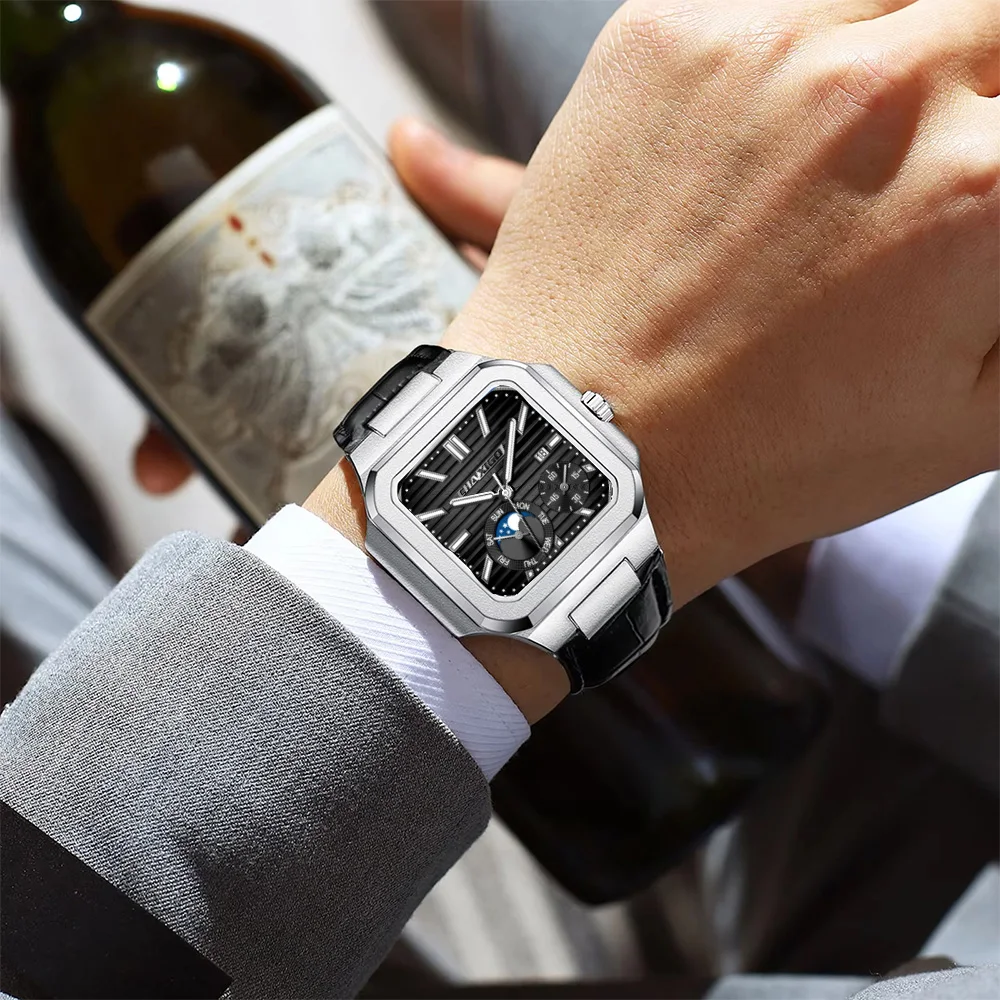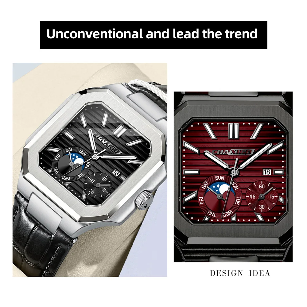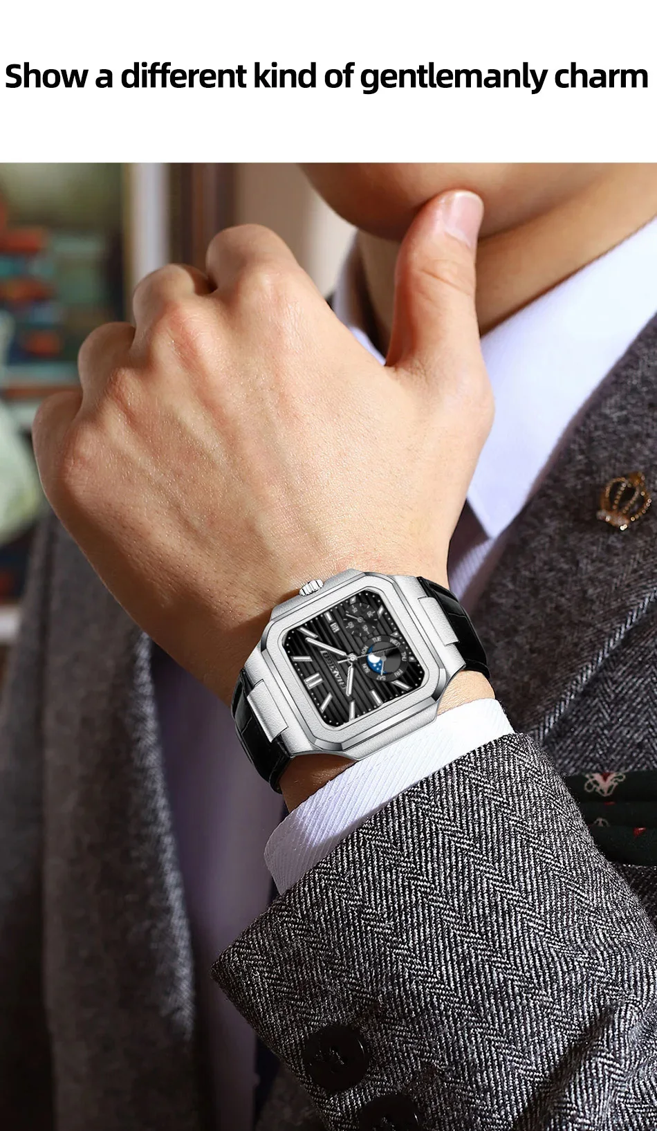 Men’s Luxury Square Watch – Quartz, Leather, Waterproof, Chronograph