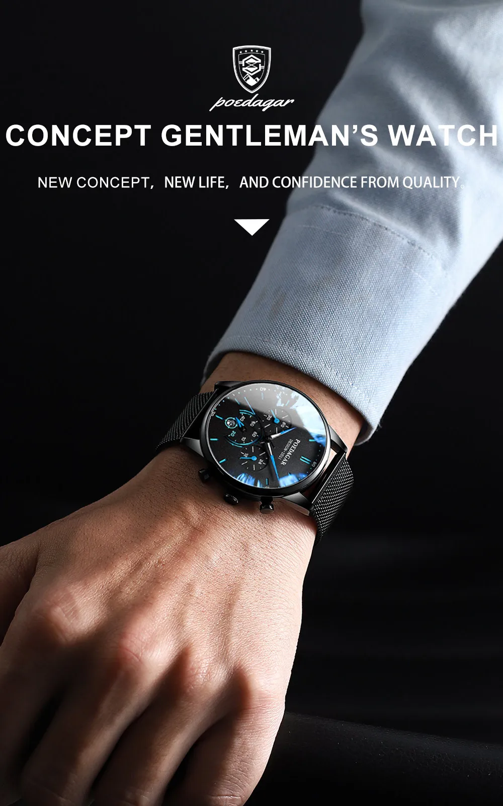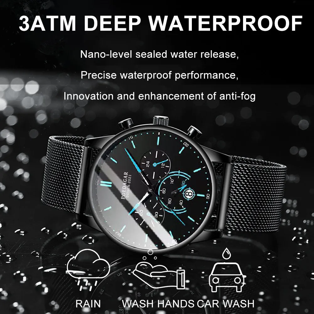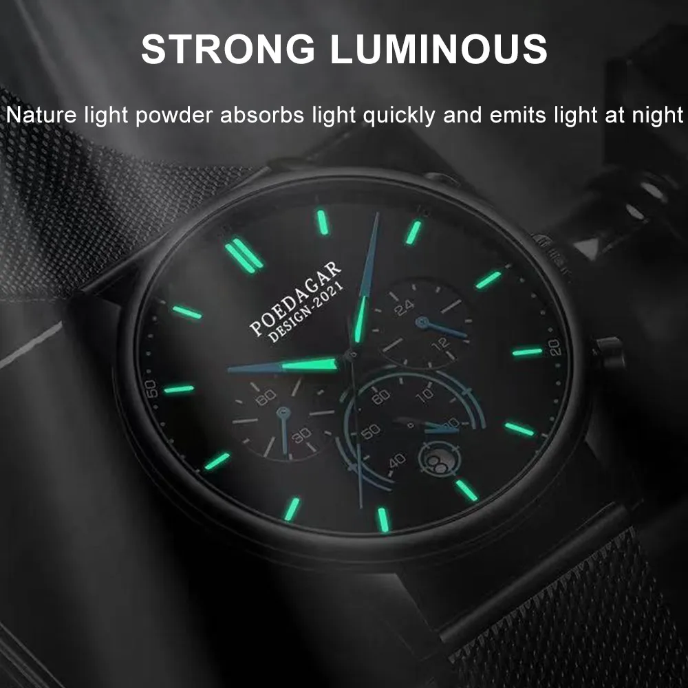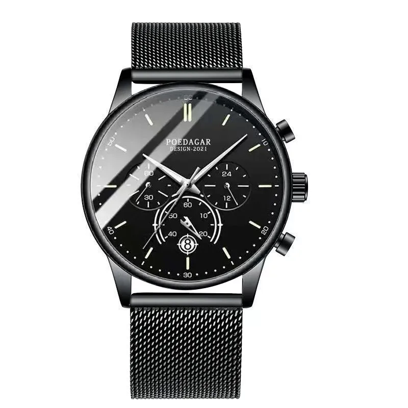 POEDAGAR Men’s Fashion Watch – Chronograph, Mesh Strap, Waterproof